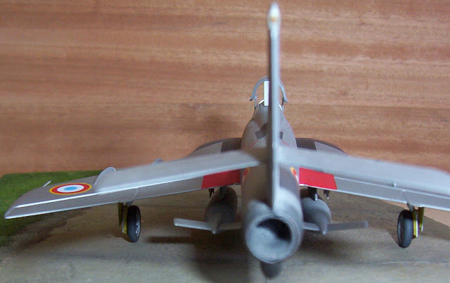 Peinture de la maquette: J'ai choisi de faire un RF-84 F de l'Armée de l'Air et tout en alu, il faisait parti de l'Escadron 1/33 "Belfort", code 33 CZ n° 37633. Le panneau anti-reflet devant sera en olive drab, extrémité de la dérive gris clair, bordure noir sur le haut de la dérive. Deux bandes noires le long du fuselage, sur le haut du fuselage derrière la verrière faire un panneau noir. Les entrées d'air seront rouge vif, et noir, pour faire du bon travail servez-vous du cache Tamiya. La sortie tuyère du réacteur sera en gun métal, ensuite vieilli.