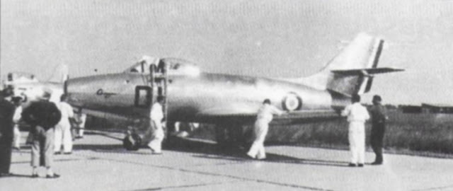 L' "Ouragan n°7 fut, en fait, le sixième exemplaire de présérie, aucun appareil ne portant en effet le numéro 4. Photographié ici à Brétigny, le numéro 7 était équipé d'un réacteur Hispano-Suiza Tay, qui offrait une poussée de 2 600 kg, très supérieure à celle du Nene.